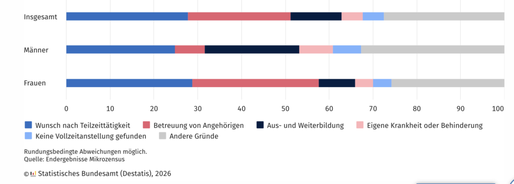 WIESBADEN – Die Gründe für eine Teilzeittätigkeit sind vielfältig und können bei Frauen und Männern unterschiedlich stark zum Tragen kommen. Am häufigsten gaben Teilzeitbeschäftigte im Jahr 2024 den eigenen Wunsch nach Teilzeit als Grund für die Reduzierung der Arbeitsstunden an. Das traf auf 27,9 % der insgesamt 13,1 Millionen Erwerbstätigen in Teilzeit zu, wie das Statistische Bundesamt (Destatis) nach Endergebnissen des Mikrozensus 2024 mitteilt. Teilzeitbeschäftigte Frauen (28,9 %) wollten demnach häufiger in Teilzeit arbeiten als teilzeitbeschäftigte Männer (24,9 %).