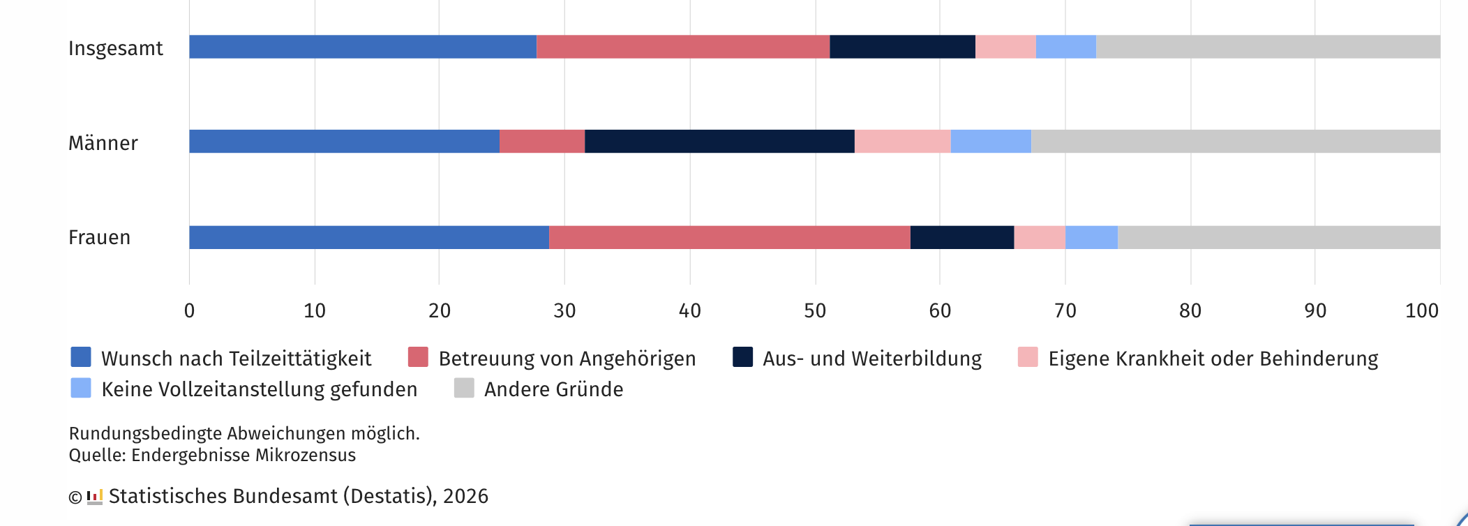 Ein weiterer Grund für das Arbeiten in Teilzeit waren die eigene Krankheit oder Behinderung (4,9 %). Weitere 4,8 % der Teilzeitbeschäftigten würden gern in Vollzeit arbeiten, konnten jedoch keine passende Stelle dazu finden. Die restlichen 27,4 % hatten andere familiäre, persönliche oder sonstige Gründe für ihre Teilzeitbeschäftigung.